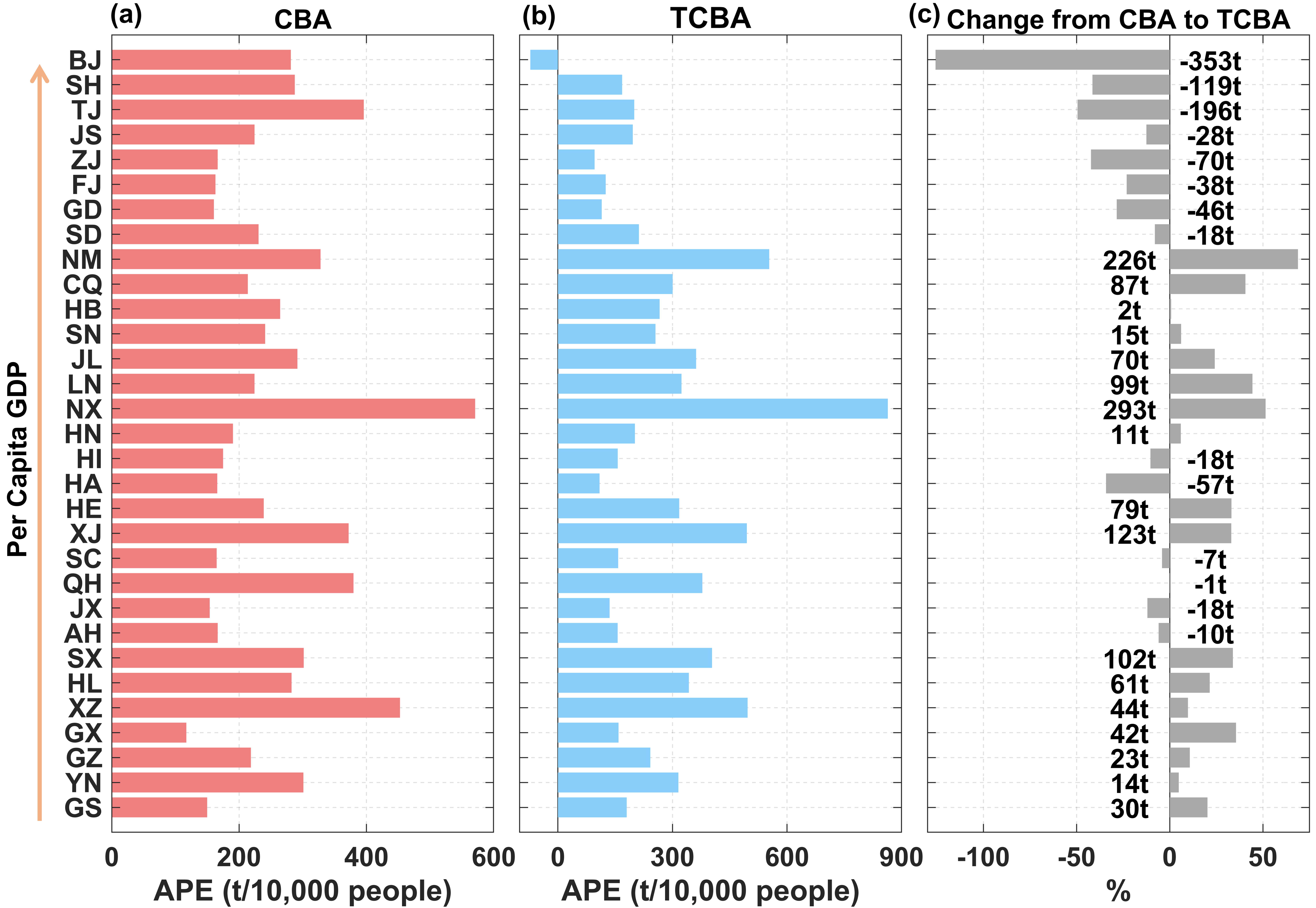 图1.(a)消费端(CBA)和(b)技术调整的消费端(TCBA)排放核算下各省排放的大气污染物当量(APE),以及(c)两种核算方法下排放的差异。