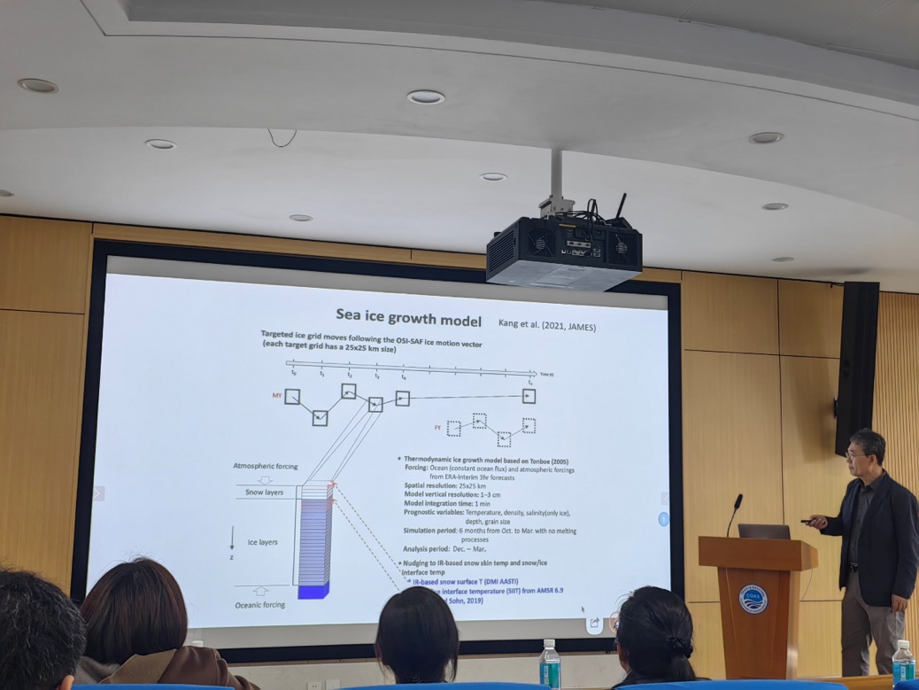 Byung-Ju Sohn教授作了题为“Surface Emissivity characteristics of Arctic Sea Ice and their implication for a three-type ice classification”的学术报告。在全球变暖导致北极海冰的范围和厚度持续减小的背景下,海冰类型作为追踪这种变化的重要参数之一,备受关注。以往通常将海冰归类为薄且具有低反照率的一年冰(FYI)和厚且具有高反照率的多年冰(MYI)两类。这样简单的分类会模糊海冰演变的物理连续性,存在一定局限,那么基于卫星获得的微波波段发射率能否提供更具物理可解释性的海冰分类呢。Sohn教授结合物理的海冰增长模型和人工神经网络方法,利用ATMS 53.7 GHz通道亮温数据反演获得了地表发射率,通过对发射率数据的统计分析,提出了介于FYI和MYI之间的混合海冰类型,该混合类型的提出进一步细化了海冰分类的物理解释。