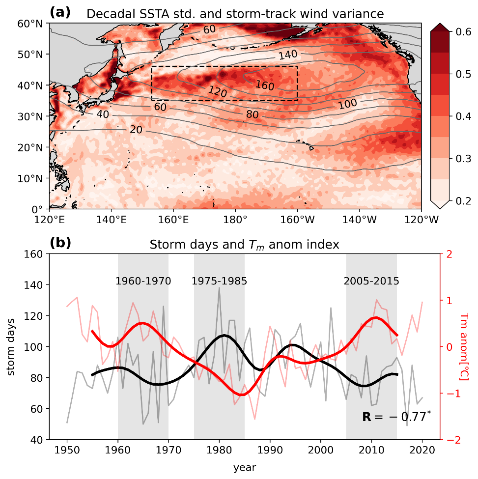 年代际气候变率是气候可预测性的关键来源之一,而北太平洋中纬度海区正是年代际变率的显著活跃区。已往的研究多聚焦于太平洋年代际振荡等大尺度气候模态的主导作用。然而随机气候模型理论指出,高频、短周期的天气扰动同样可通过持续累积效应影响低频海洋变化。最新的研究表明,天气尺度风暴能通过累积作用显著影响上层海洋的年际变率,但其在年代际尺度上的具体贡献与相对重要性,尚缺乏系统的定量评估。
