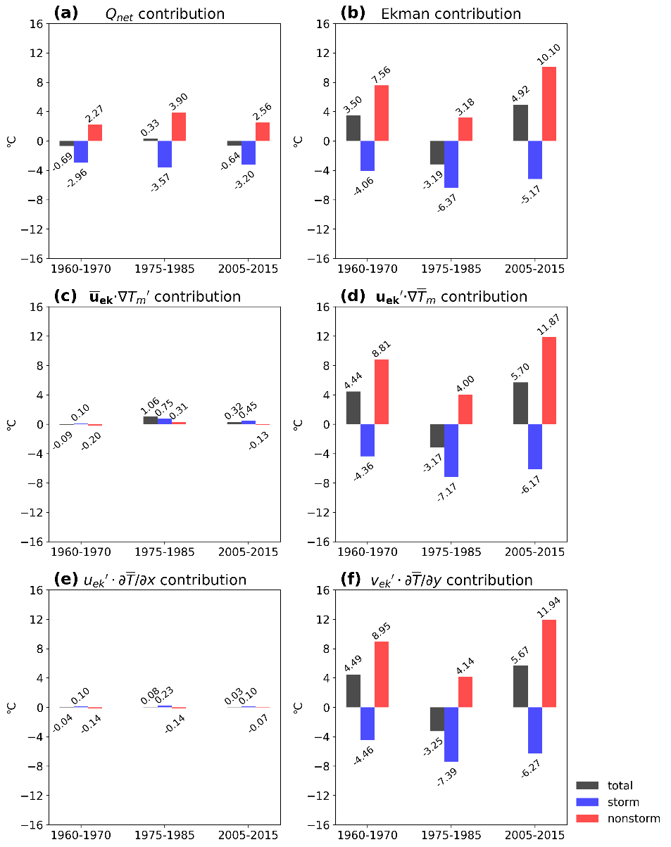图2.基于逐日ERA5大气数据与逐月IAP海洋数据,混合层温度的年代际变化及其风暴日与非风暴日各自的贡献。(a)净海气热通量与(b)埃克曼热平流在三个选定的时期内对混合层温度变化的时间积分贡献。柱状图表示各时期的时间积分总贡献(黑色),其中蓝色为风暴日贡献,红色为非风暴日贡献。