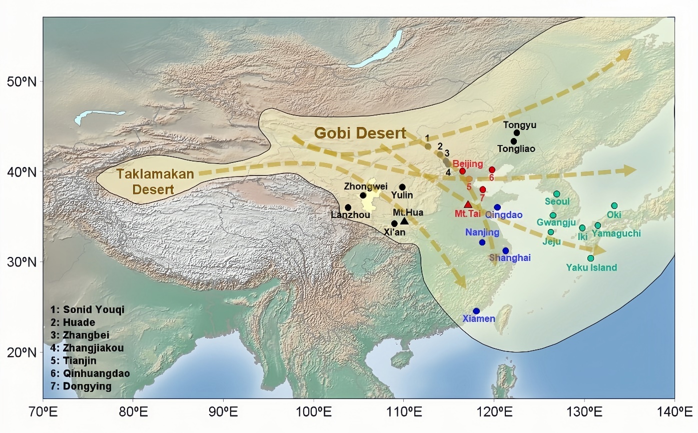 图1.东亚受尘影响的主要区域及观测点位置。其中,棕色箭头表示沙尘的主要传输路径,黑点、红点、蓝点和绿点分别表示沙漠毗邻地区、华北地区、华东地区及日韩地区的观测点。