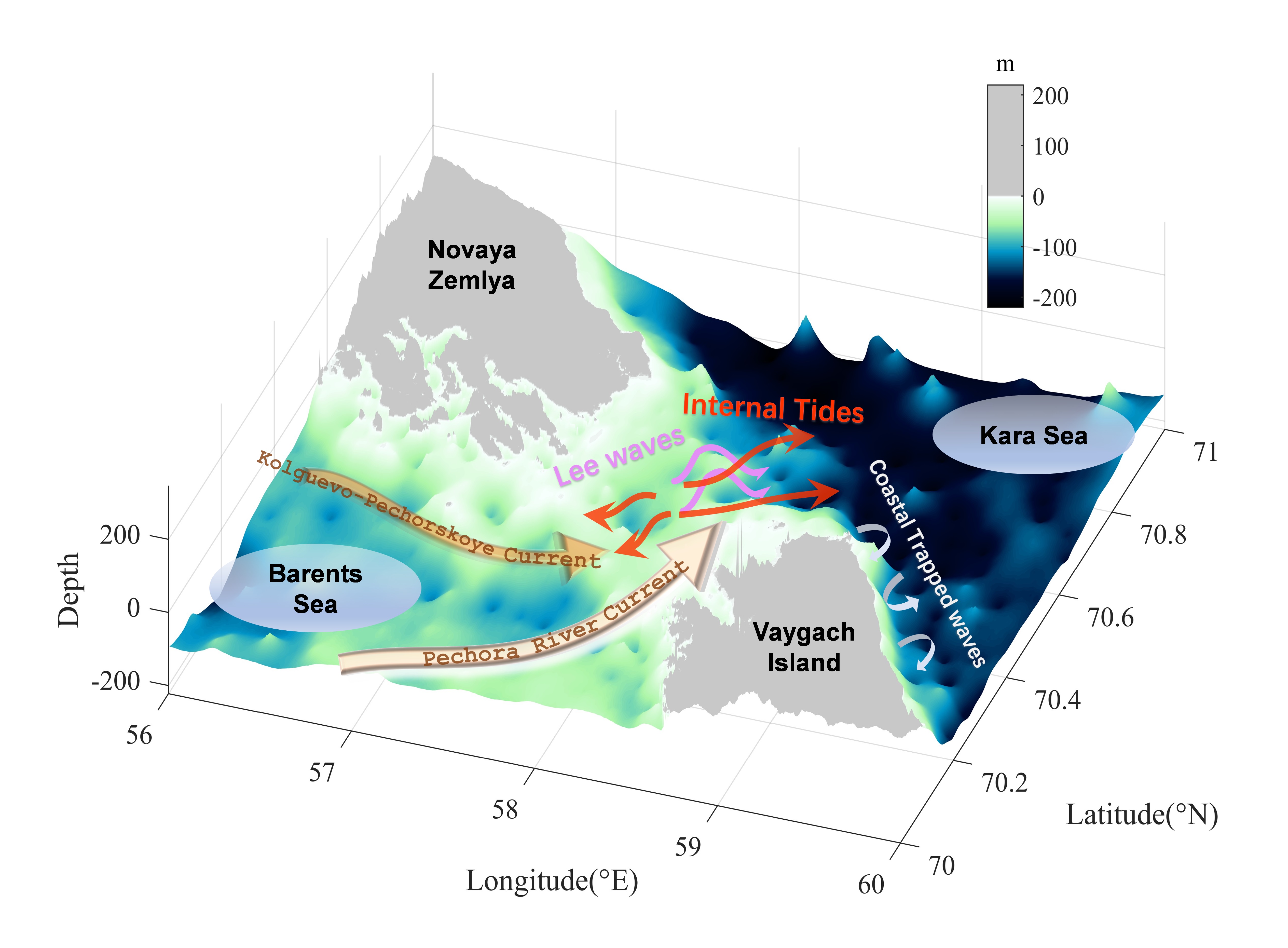 巴伦支海-喀拉海(BKS)区域是北极海冰变化的敏感核心区。喀拉海峡不仅是该区域海冰输运与能量传递的关键枢纽,更是北极东北航道的重要节点,具有突出的科研价值与战略意义。喀拉海峡地形复杂且潮汐活动强盛,导致该区域海洋内波活跃。内波一方面可通过驱动海水垂向混合,调控海洋热收支平衡,进而影响海冰变化;另一方面还能通过改变海-气热量交换过程作用于大气环流,对欧亚中高纬度的天气与气候产生影响。此外,内潮分裂所激发的大振幅内孤立波,还可能对北极航道的通航环境构成潜在威胁。当前,针对喀拉海峡内波的研究仍较为匮乏,这不仅制约了学界对BKS区域海冰-气候相互作用机制的深入认知,也为北极航道的安全规划与运营带来了挑战。