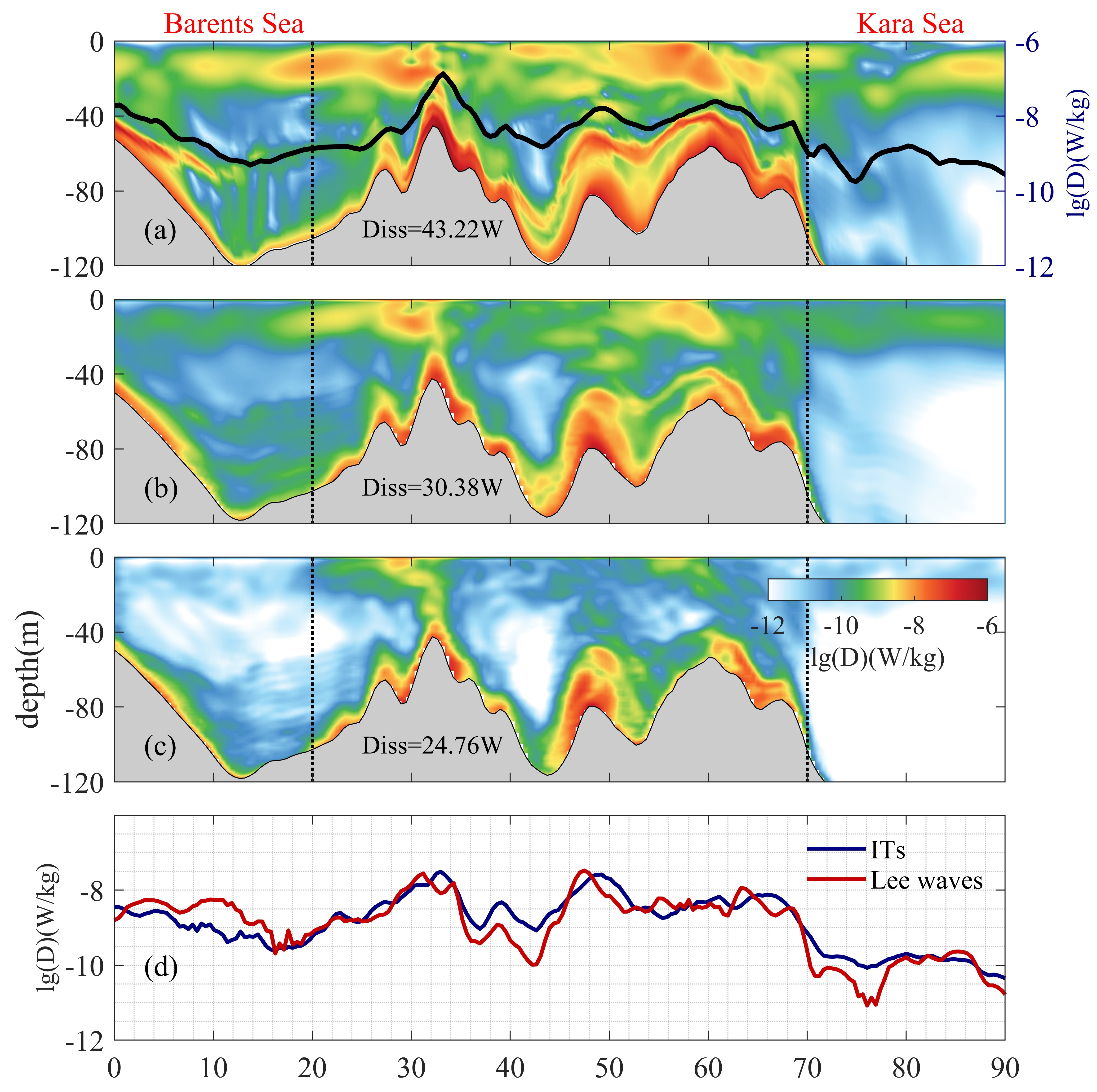 本研究基于CROCO海洋数值模式,针对喀拉海峡M₂内潮的生成、传播及耗散过程开展了系统性探究。研究结果显示,除海峡中部已被发现的内潮源外,瓦伊加奇岛的陆坡区域是另一处重要的内潮生成源地,且其能量强度甚至超过了海峡中部区域(图1)。背景环流将内潮限制在瓦伊加奇岛陆坡外侧约10公里的范围内,形成了一种特殊的沿岸捕获波。此类沿岸捕获波以高模态结构为主,伴随强烈的垂直剪切作用与能量耗散现象,对北极边缘海的混合过程与水团转化具有重要影响。此外,通过拉格朗日滤波方法在海峡中央区域成功实现了内潮与山后波的分离,并分别评估了二者的耗散作用。结果表明,山后波引起的能量耗散范围可达10⁻⁷至10⁻⁶W/kg,与内潮引起的耗散水平相当(图2)。然而,在以往的多数研究中,山后波在驱动局部混合过程中的作用被严重低估。