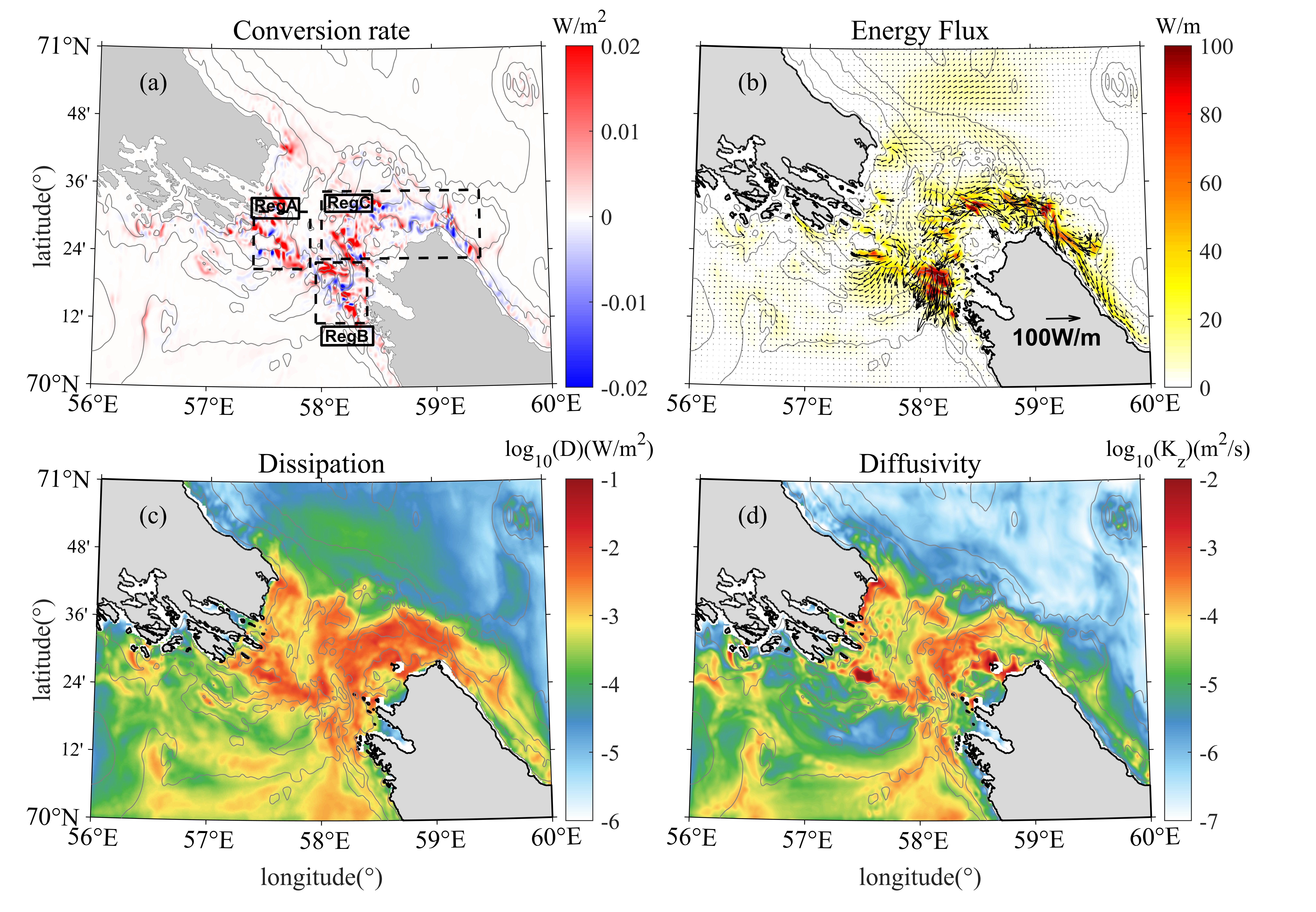 图1. (a)正压潮向斜压潮能量转化率(单位:W/m²),(b)M2内潮的能量通量(单位:W/m)。(c)深度积分斜压能量耗散率(单位:W/m²)与(d)深度平均的跨等密度面扩散系数(单位:m²/s)。