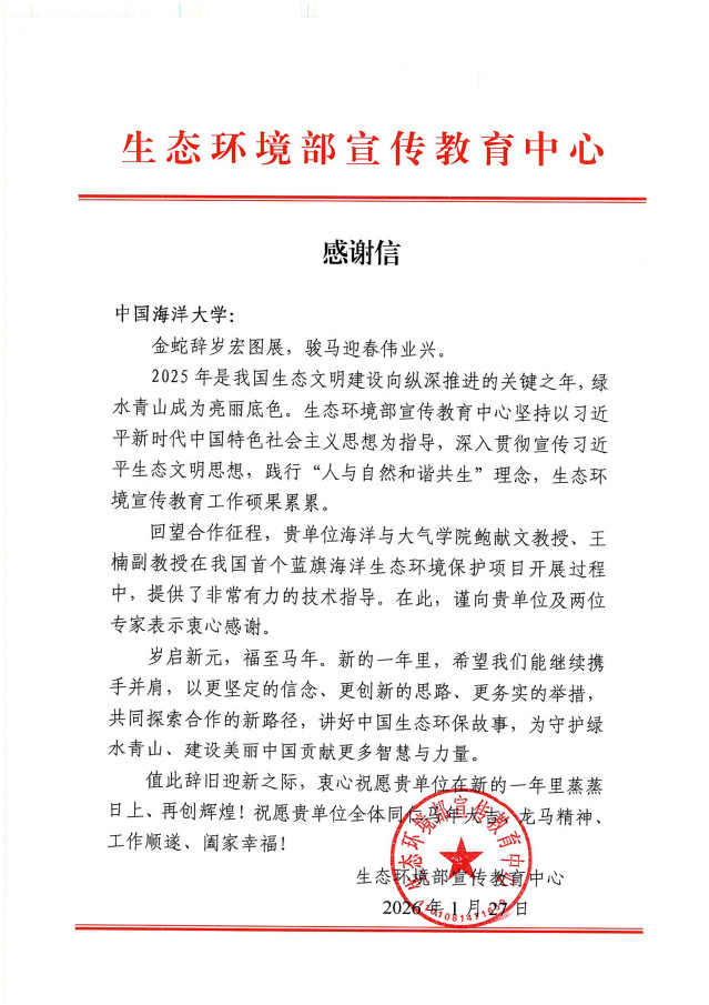 近日,生态环境部宣传教育中心向中国海洋大学发来感谢信,感谢学校和海洋与大气学院鲍献文教授、王楠副教授在我国首个蓝旗海洋生态环境保护项目开展过程中提供了有力支持。